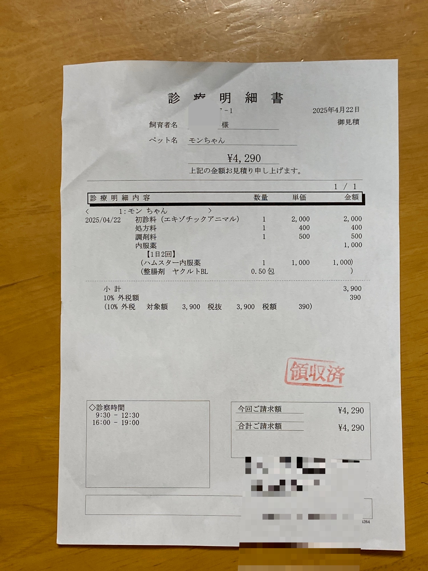 진료비는 약 포함 4290엔.